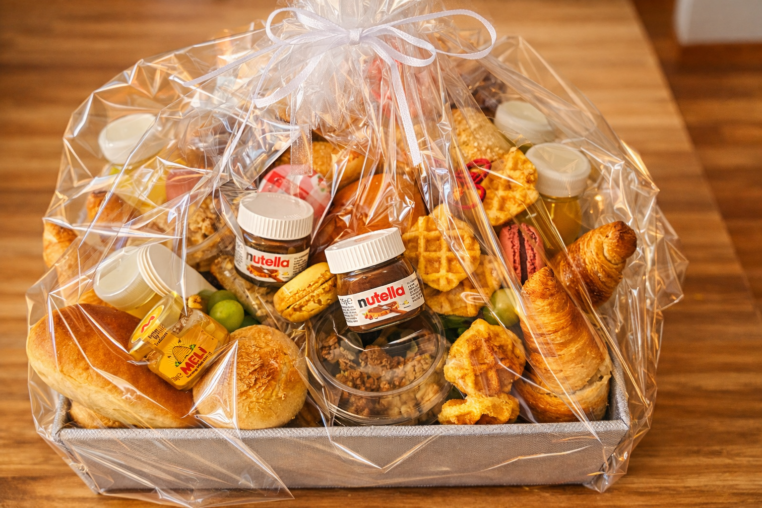 Het is een praktische en gezellige combinatie van zoet en hartig, mooi gepresenteerd in een mand, ideaal als ontbijt thuis of als klein cadeautje 🎁.